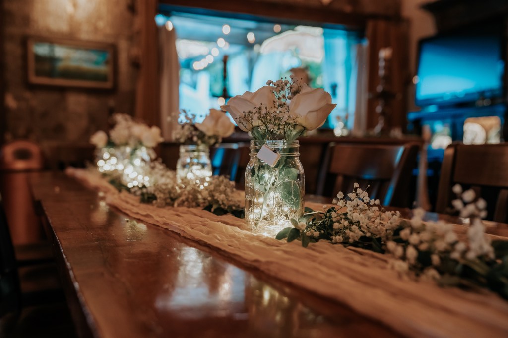- Decor: DIYed most of their decorations and favors. (Mason Jars, Fairy Lights, Cheese Cloth, cuttings from trees and plants around the venue… with the owners permission)